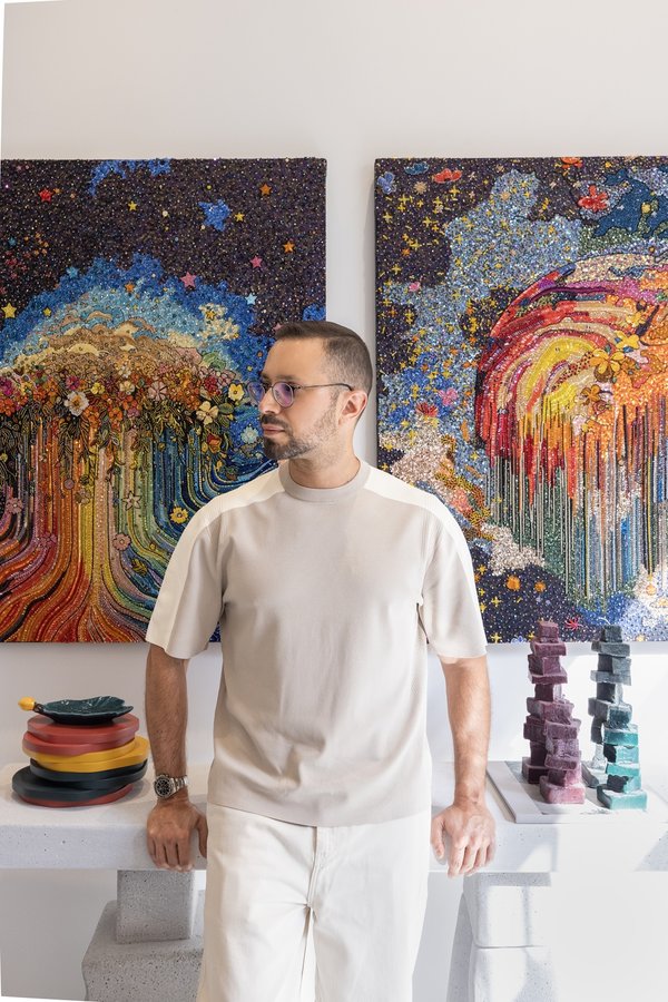 يضم المعرض 22 عملاً فنياً مستوحى من المجرة والفضاء، حيث يمزج الفنان بين الألوان والضوء والملمس باستخدام تقنيات الهوت كوتور، من كريستالات سواروفسكي إلى خيوط رافيا وحبات زجاجية، ليحوّل كل قطعة إلى لوحة حية تنبض بالخيال.