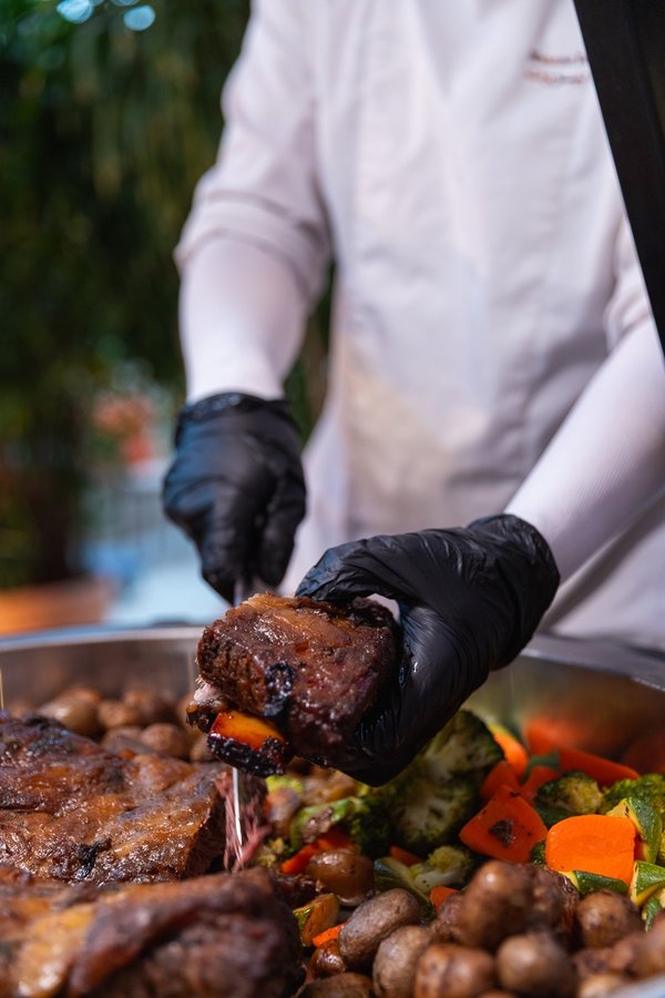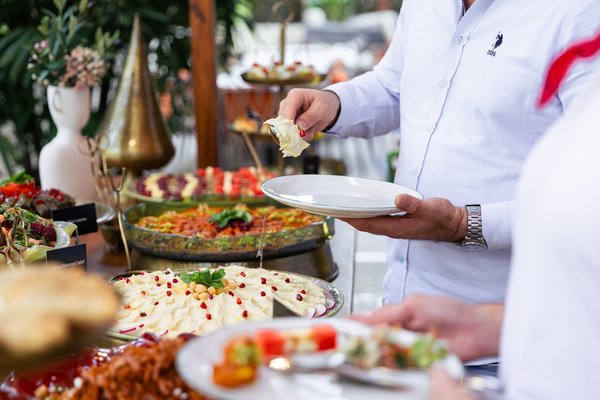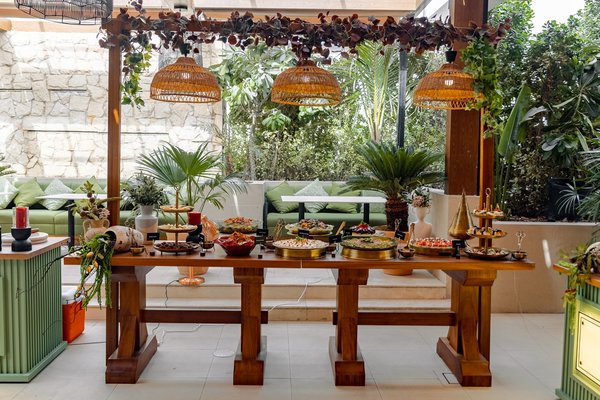 ويمتدّ هذا المشهد المبهج مع بوفيه فاخر صُمّم بعناية باستخدام النحاس والزجاج اليدوي، ويضم مازات باردة وساخنة ومقبلات لبنانية وعالمية وأطباقًا مختارة تجسّد دفء الضيافة اللبنانية.