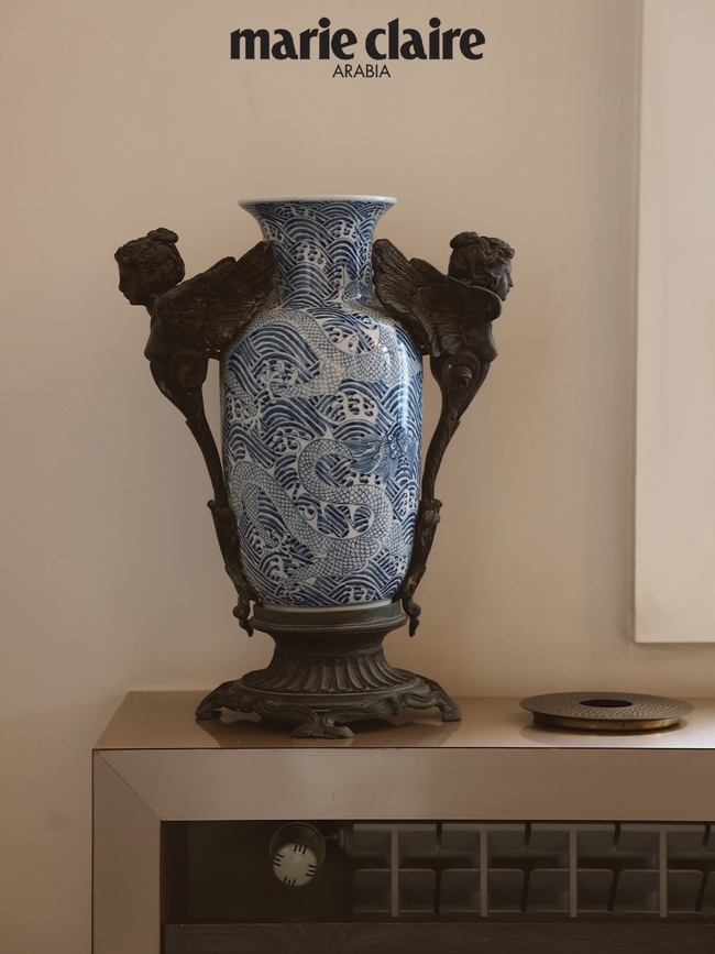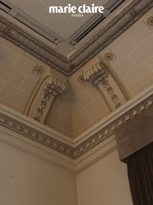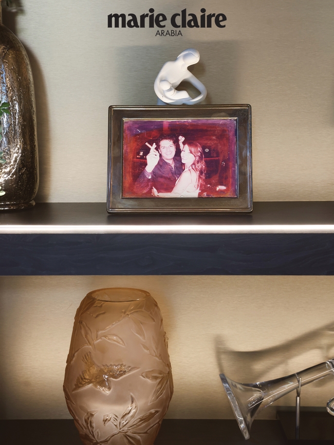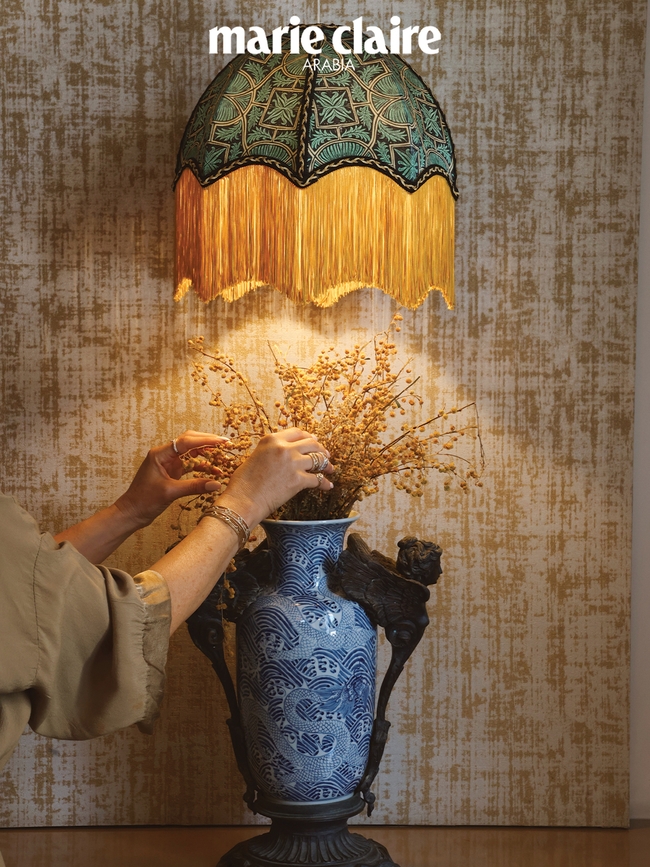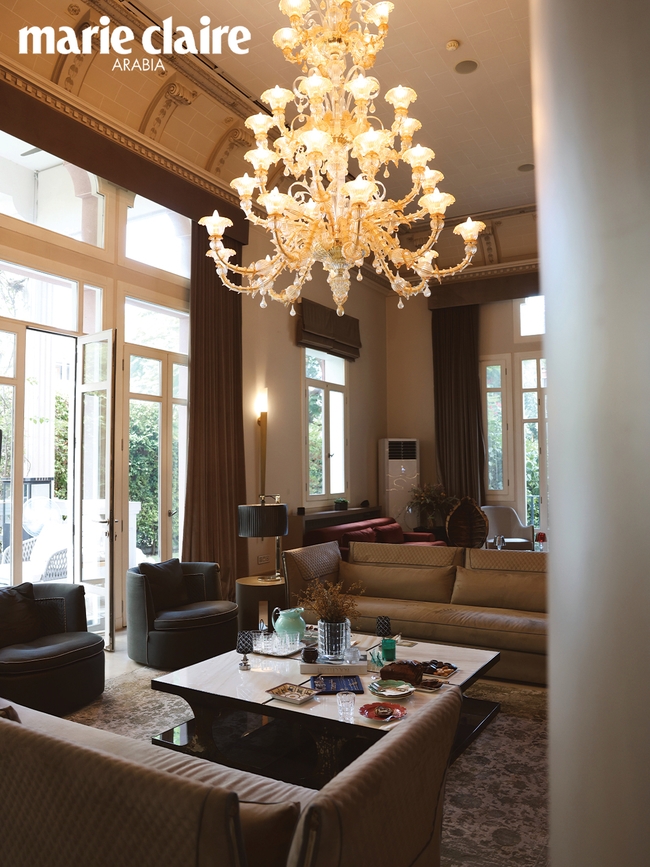 الثريا في صالوننا الرئيس هي واحدة من أعزّ القطع على قلبي. إنّها بمثابة منحوتة تضفي حيوية على الغرفة. ثمّ هناك السقف، فالأقواس بتفاصيلها المطليّة تحمل بعداً شخصياً كبيراً بالنسبة إليّ. وقد ابتكرت مزيج الألوان بنفسي، ودهنت قوساً واحداً يدوياً، ثمّ طلبت من الحرفيين تكرار النمط نفسه. وفي كلّ مرّة أنظر فيها إلى الأعلى، أرى جزءاً منّي منعكساً أمامي.