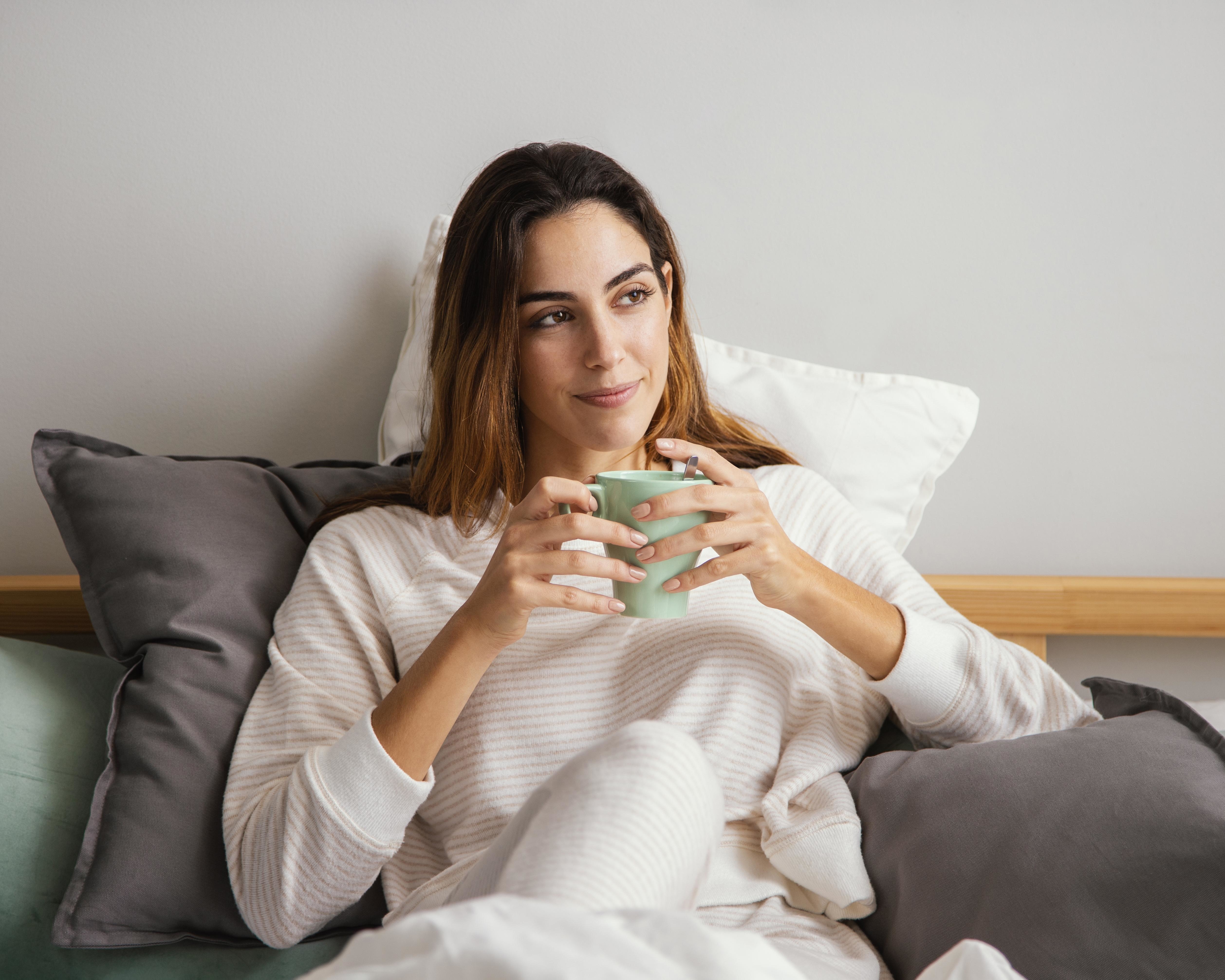 امرأة تتناول كوبًا من الشاي لتهدئة التهاب الحلق