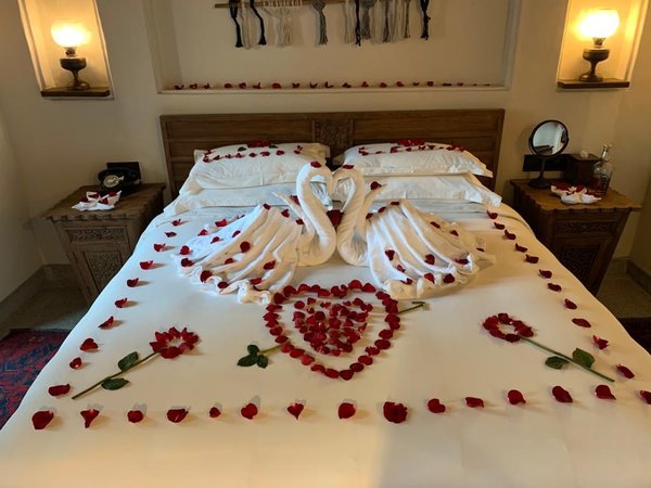 بالإنتقال إلى الفندق، ففضلاً عن تنسيق زفاف لـ150 شخصاً، يقدّم لك الوجهة المثاليّة لقضاء شهر العسل، من 190 غرفة نوم فاخرة من 10 بيوت عربيّة تقليديّة أصيلة لتختاري منها ما يُناسبك.