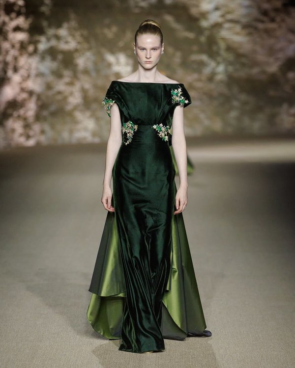 أما عدنان أكبر فقدّم لمسته الخاصة عبر تصاميم انسيابية فاخرة تُبرز الرقي والنعومة، حيث ظهرت الأقمشة المنسدلة من الأكتاف والتطريزات الدقيقة بأسلوب يوازن بين البساطة والفخامة.