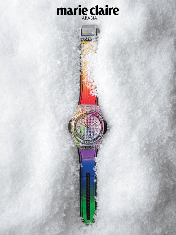 تحفة ملوّنة تنبض بالحياة والفخامة. تُزيَّن بتدرّجات أحجار كريمة تعكس ألوان قوس قزح على الإطار والميناء المرصّع بالكامل بالألماس. يجتمع فيها الذهب الوردي مع سوار بتدرّج لوني مميّز، لتجسّد روح الجرأة والإبداع التي تُميّز دار Hublot.